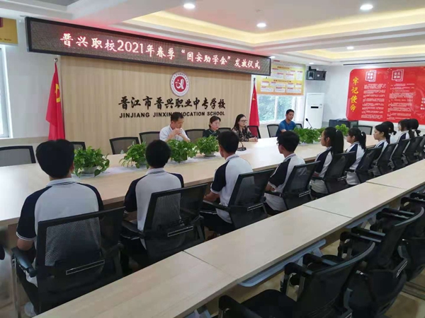 6月1日下午,晋兴职校春季学期“国安助学金”发放仪式在综合楼三楼会议室举行。校长助理张丽琼、泉州市国安餐饮服务有限公司副总经理李晓艳等参加发放仪式并讲话。发放仪式由总务处主任曾日东主持,10名品学兼优且未能享受国家助学金资助的家庭经济较为困难学生每人在此获得了500元的“国安助学金”。