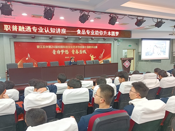 12月21日,我校在张林校区实训楼举办“职普融通”专业认知讲座。本次活动由学校轻工部主任詹金华主持,学校食品加工工艺专业群负责人、泉州市技能名师工作室领衔人卢云真老师主讲,为学子们深入解读职业教育发展方向,解锁职普融通新赛道。