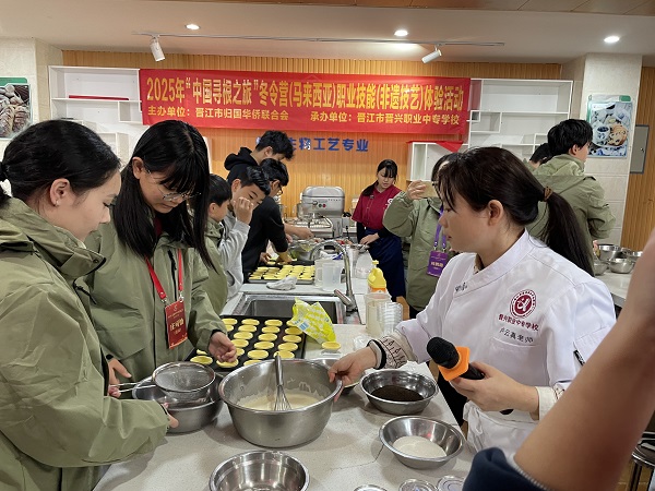 2025年12月28日,晋江市晋兴职业中专学校迎来两批特殊的客人——澳大利亚和马来西亚“中国寻根之旅”冬令营近90名华裔青少年。当天的非遗技艺体验活动中,营员们通过西式烘焙、饮品制作、闽菜烹制等特色课程,感受中华传统文化与现代职业教育的融合魅力,追寻文化根脉,缔结跨国友谊。