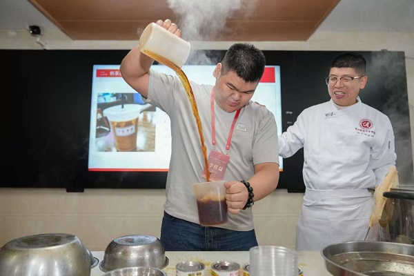 二、饮料的调制:醇香里的文化融合 食品专业教师蔡良根带来丝袜奶茶制作体验,讲解茶叶选择、冲泡水温要点,重点演示拉茶过滤工序。营员们反复练习掌握技巧,亲手调制的奶茶醇厚丝滑,让大家在味觉体验中感受多元文化融合之美。