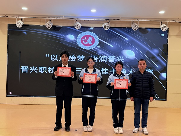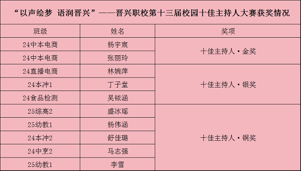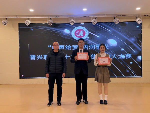 1月5日晚,我校第十三届 “以声绘梦 语润晋兴” 校园十佳主持人大赛圆满收官。 本次大赛吸引 56 名学子报名,经初赛筛选,17 名选手晋级决赛。决赛中,选手们通过自我介绍、诗词朗诵、模拟现场报道三大环节,展现扎实语言功底与自信台风,赢得现场掌声。最终,大赛评选出金奖 2 名、银奖 3 名、铜奖 5 名,学校相关领导为获奖选手颁奖。